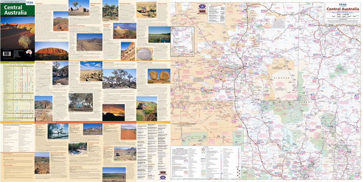 At 1:2,000,000 this is a small scale map, but it manages to fit in an amazing amount of information. All seven of the main outback trips are covered on it with all the detail you'll need to plan a trip. The complete Tanami Track is there, thanks to an insert of the top section, and there's a list of National Park facilities. Hundreds of key locations are marked with lat and long so you can find them easily. The detail on the map now includes where fuel is on sale and what types they have, even autogas. If you're worried about paying for your fuel it shows the EFTPOS facilities too. Finally you get a list of contact numbers that should see you right no matter where you've ended up.
