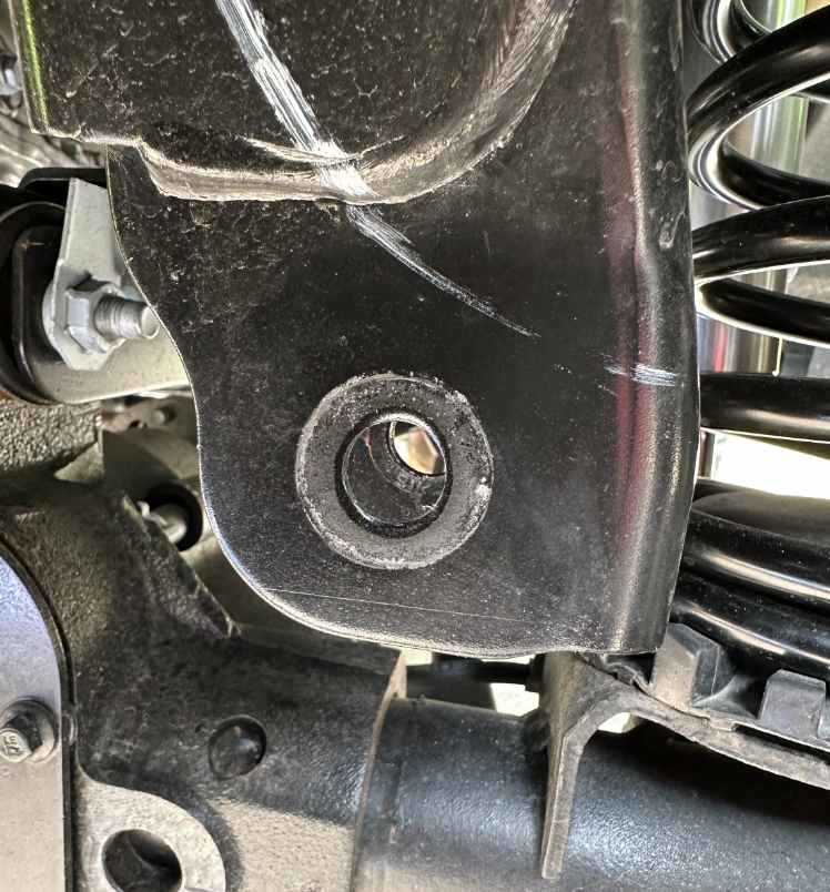 The photo below is of a chassis track bar mount that has become ovaled (wallowed) out. This must be repaired to fix the Death Wobble scenario.