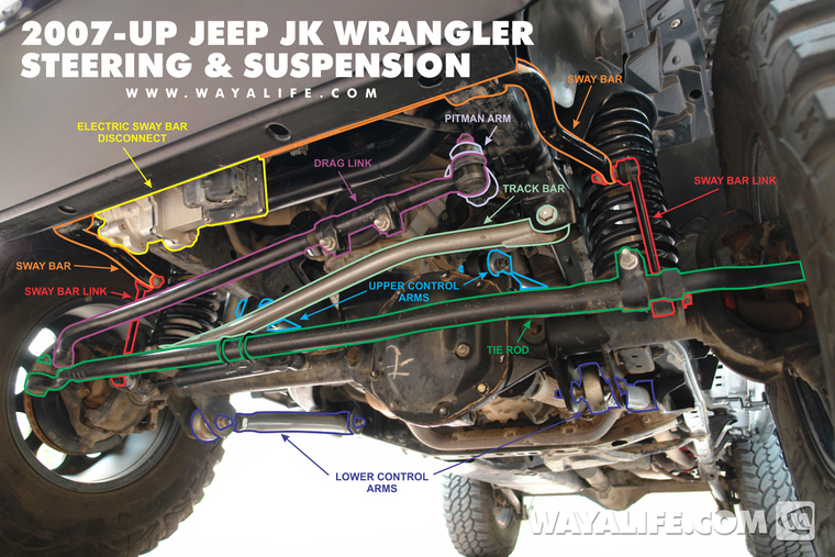 It's important to understand the name and function of each of the steering and suspension components under the front end of your Jeep. The
