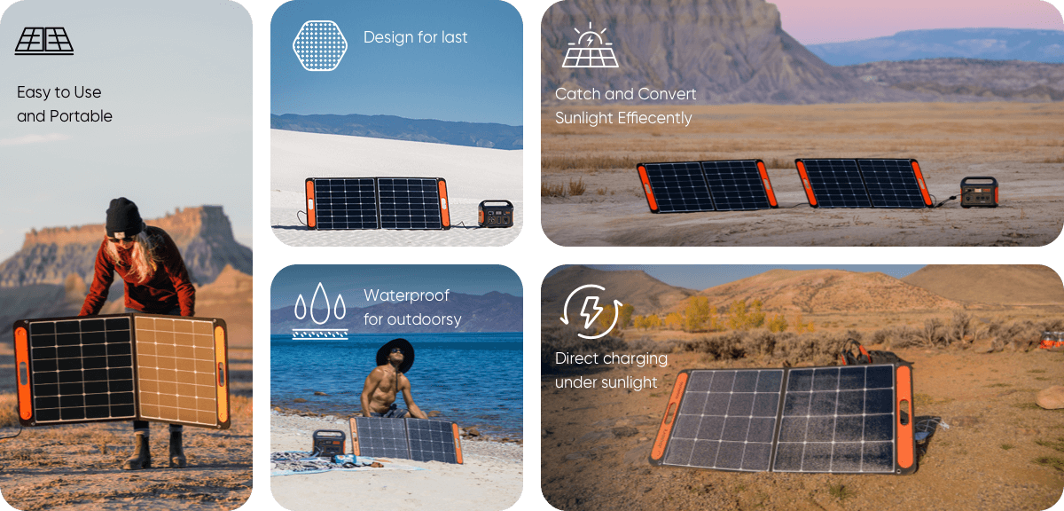 Jackery SolarSaga 100W Solar Panel - converts solar to renewable power with this monocrystalline solar panel. With a high solar conversion efficiency of 23%, it's perfectly suited for outdoor activities and for emergency power outages. The ETFE-laminated case extends the lifespan of the solar panel, and weighs in total just 4.69 kg. It's lightweight, foldable, IP65 waterproof-rated, and easy to carry around for taking on your off-grid adventures.