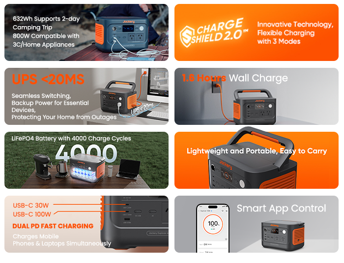 Experience the ultimate portable power solution with the Jackery Explorer 600 Plus. With an 800W output and 632Wh capacity, it supports a variety of outdoor devices, from coolers to camping lights.